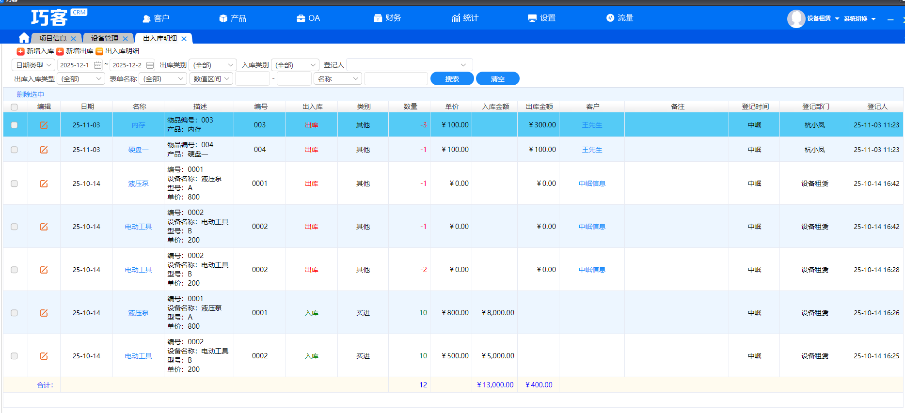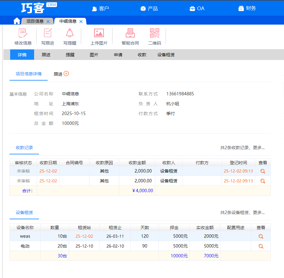 客户全掌握:信息自定义,跟进有提醒,项目资料/图片一键上传,每个客户详情一目了然!设备了如指掌:从入库到出库,精准追踪每套设备,库存不足自动预警,再也不怕手忙脚乱!收款及时到:应收款清晰记录,智能提醒待收款,现金流清清楚楚,准时回款没烦恼!