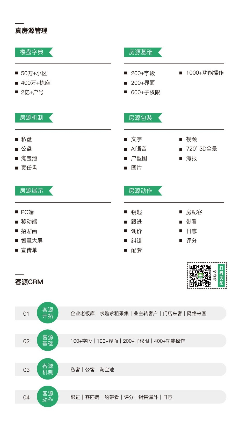 特色功能有:终端/网络/APP信任连接管理;内置全国60万楼盘字典库数据、2亿套房屋信息、周边配套、学区信息、成交信息等;一键发布上网;隐号拨打;VR视频上传;积分考核系统;房屋托管系统;MLS联盟平台;小程序自动获客;微官网真房源管理;海报/房源分享;访客档案/浏览轨迹管理;